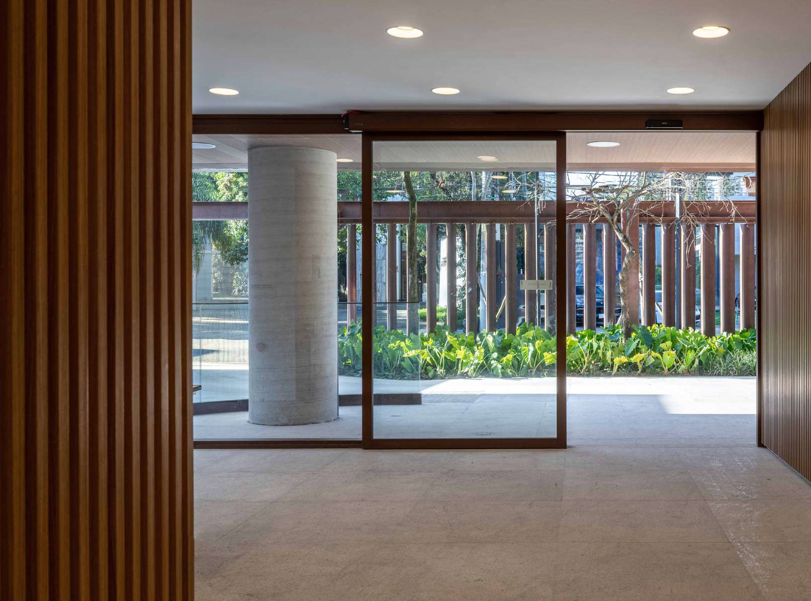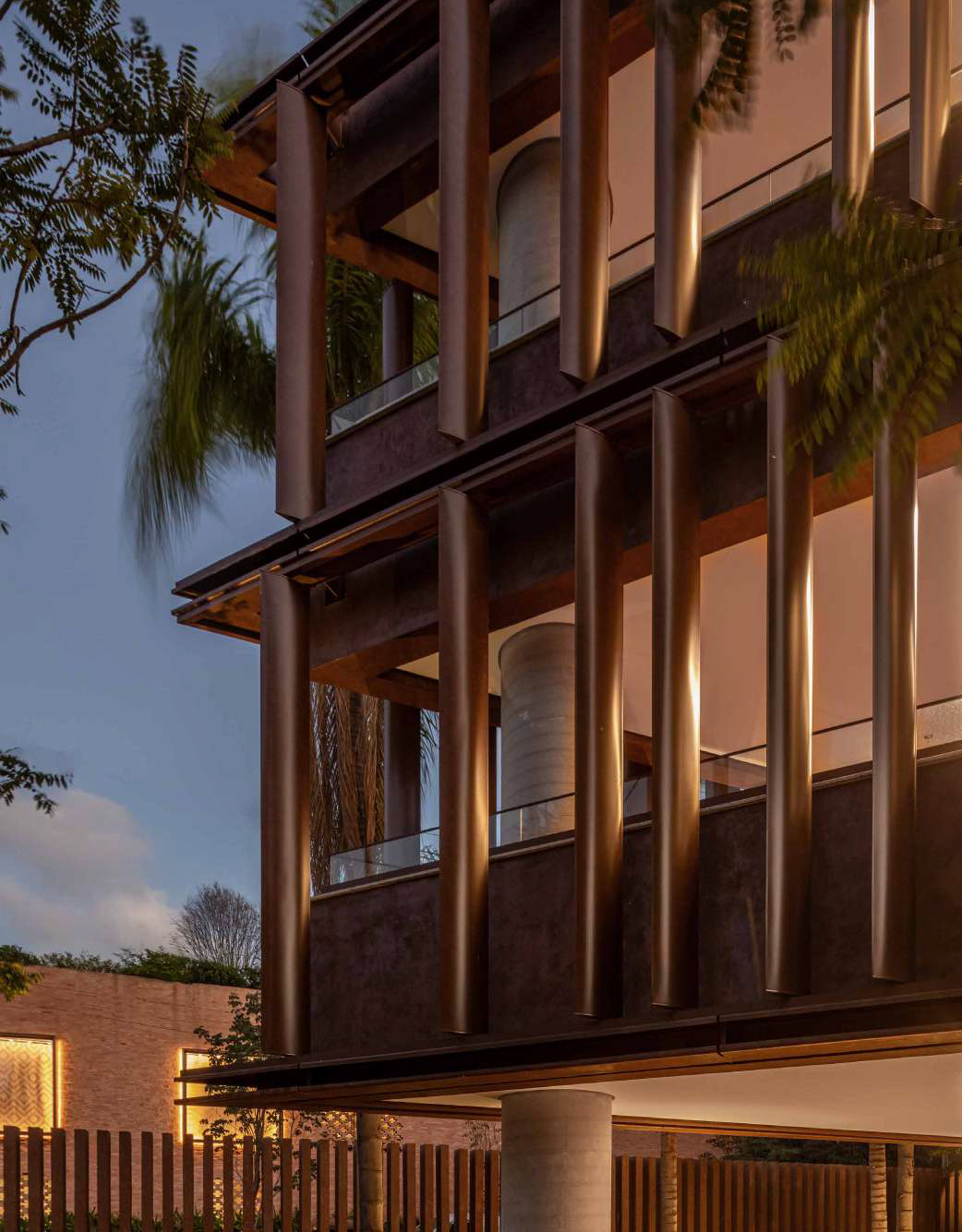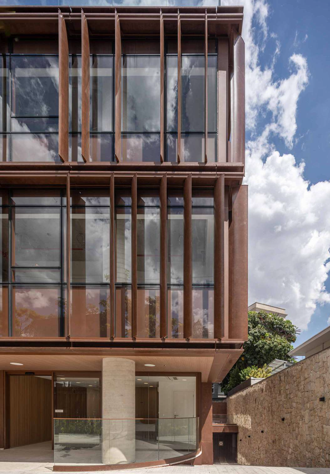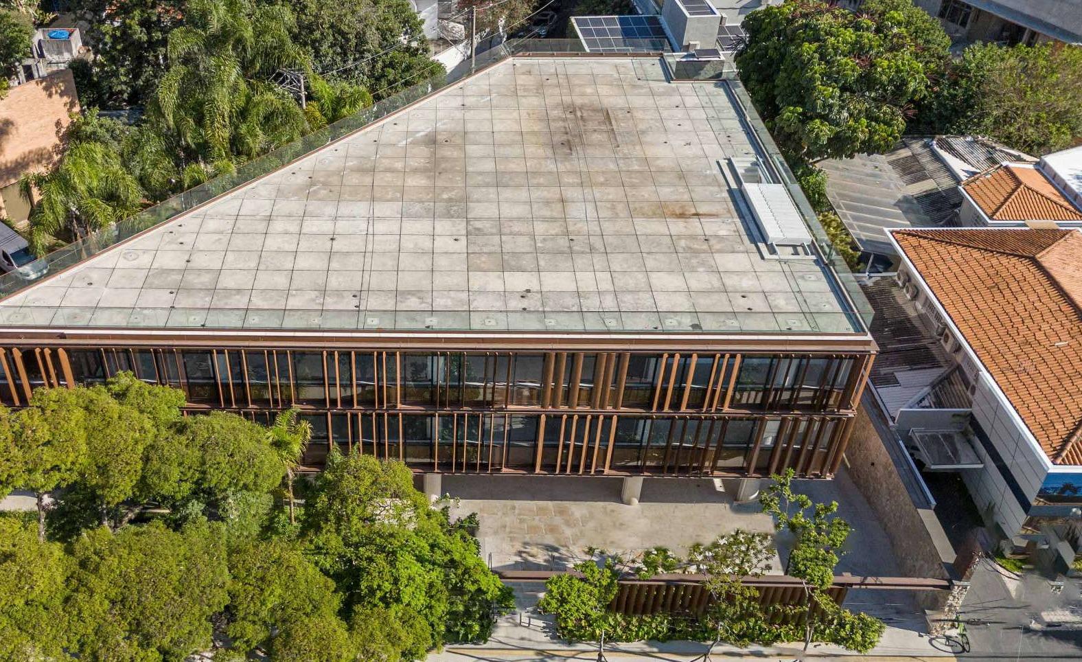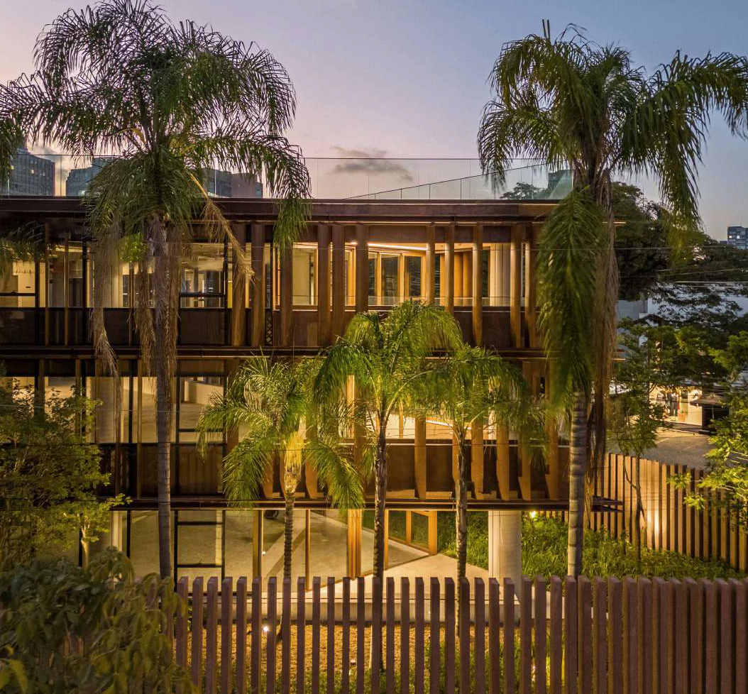 Os acabamentos são de alta qualidade, com destaque para o aço corten, que proporciona resistência, durabilidade e um estilo atemporal. Muros de pedra moledo envolvem o edifício, celebrando a brasilidade e acrescentando um toque rústico e orgânico ao design.